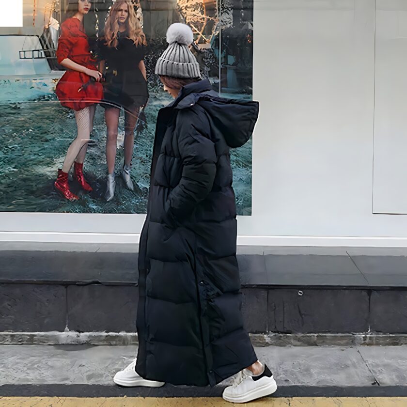 La doudoune matelassée noire descend presque jusqu'aux chevilles. Idéale pour le grand froid.